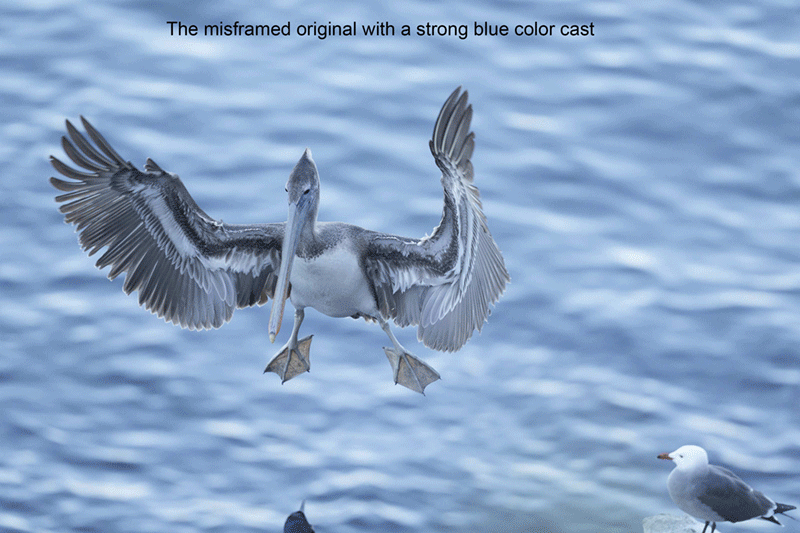 The pied-billeds in Images #1 & #2 were lit by the sun. Working in Manual (exposure) mode, the analogue scale showed +2/3 of a stop. The color balances were fine and the colors looked quite natural. The birds in Images #3, #4, and #5 were in the shade. The analogue exposure scale showed close to +2 stops. These images showed a distinct blue cast that was largely removed by increasing the color temperature during the raw conversion. ACR masks were used to lighten and further warm up the birds and to remove the remainder of the blue color cast especially from the wings of the bird in the rear of Image #5.
