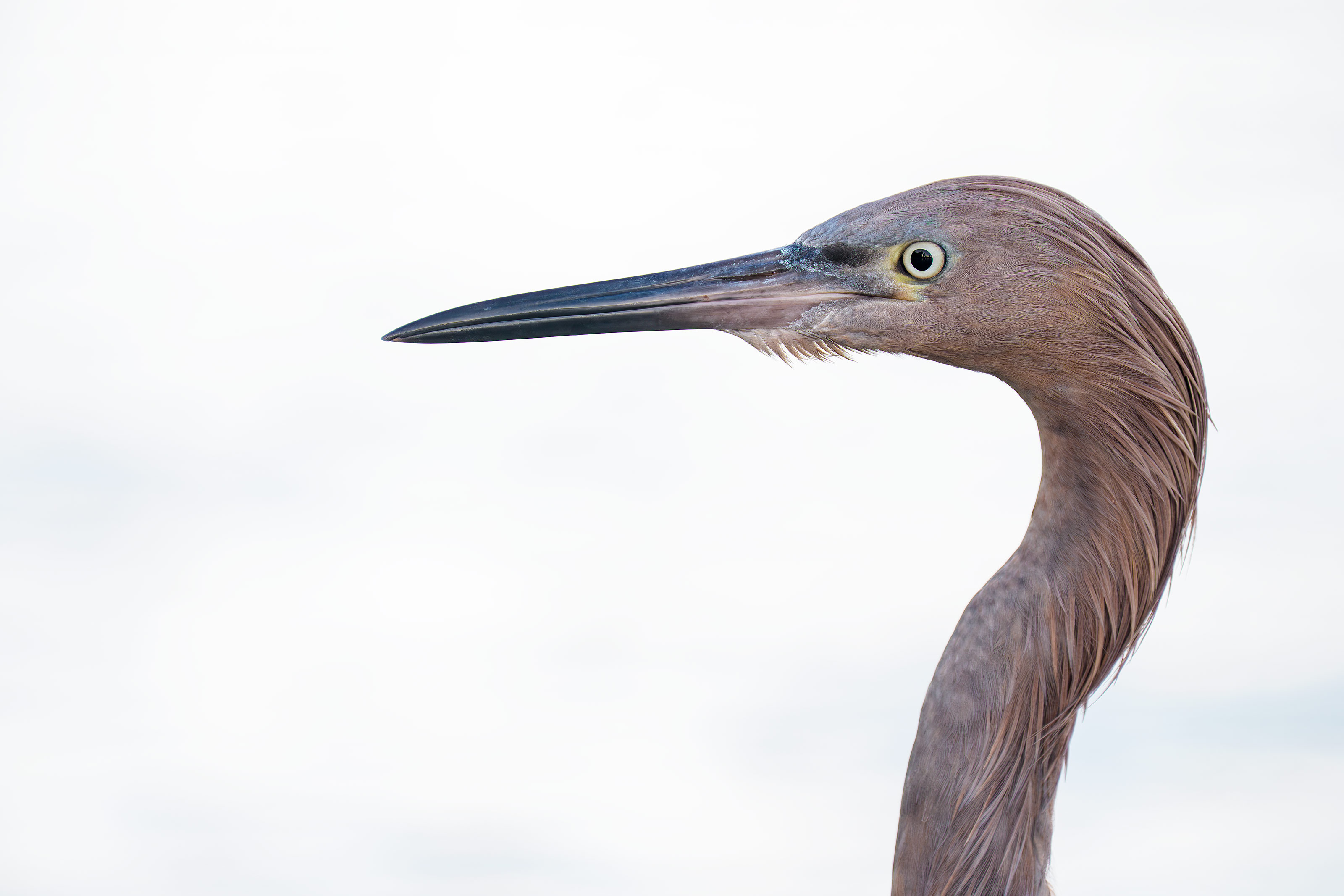This image was created on 11 October 2025 by Alvin “Red” Stevens of Birmingham, AL. crouching as instructed, he used the handheld Sony FE 70-200mm f/2.8 GM OSS II Lens with the Sony FE 2x Teleconverter (at 394mm) and The Latest Greatest Sony Flagship Body, the a1 II Mirrorless Camera. The exposure was determined by Zebras with ISO on the rear wheel — ISO 800: 1/500 second at f/5.6 (wide open) in Manual mode. AWB at 6:25:34pm afternoon in the shade on a sunny afternoon. Wide/AF-C with Bird-Eye/Face Detection performed perfectly. Click on the image to enjoy the larger, inexplicably sharper high-res version. Image #1: Reddish Egret head portrait |