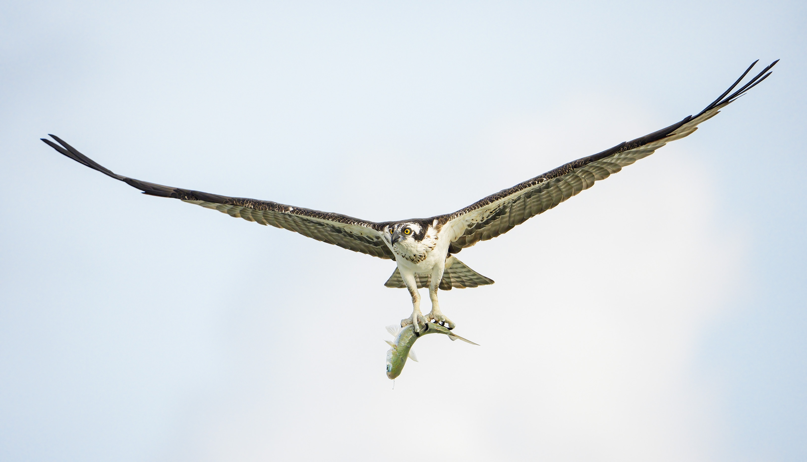 This image was created by Eugen Dolan on 4 October 2025 at Sebastian Inlet State Park on a BIRDS AS ART Extended Instructional Photo-Tour (IPT). Standing at full height, he used the used the hand held Sony FE 70-200mm f/2.8 GM OSS II Lens (at 600mm) and The Latest Greatest Sony Flagship Body, the a1 II Mirrorless Camera. The exposure was determined via Zebras with ISO on the Thumb Wheel. ISO 4000: 1/3200 sec. at f/6.3 (wide open) in Manual mode. RawDigger showed that the exposure was perfect. AWB at 8:01:14am on a cloudy morning. Wide/AF-C with Bird-Eye/Face Detection performed perfectly. Click on the image to enjoy the larger, inexplicably sharper high-res version. Image #3: Osprey with fish |