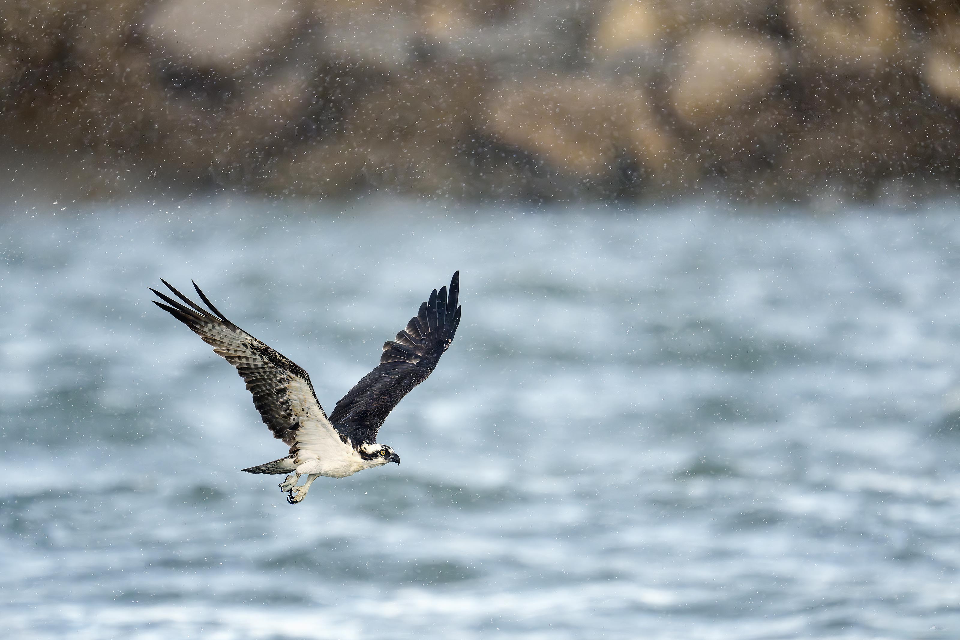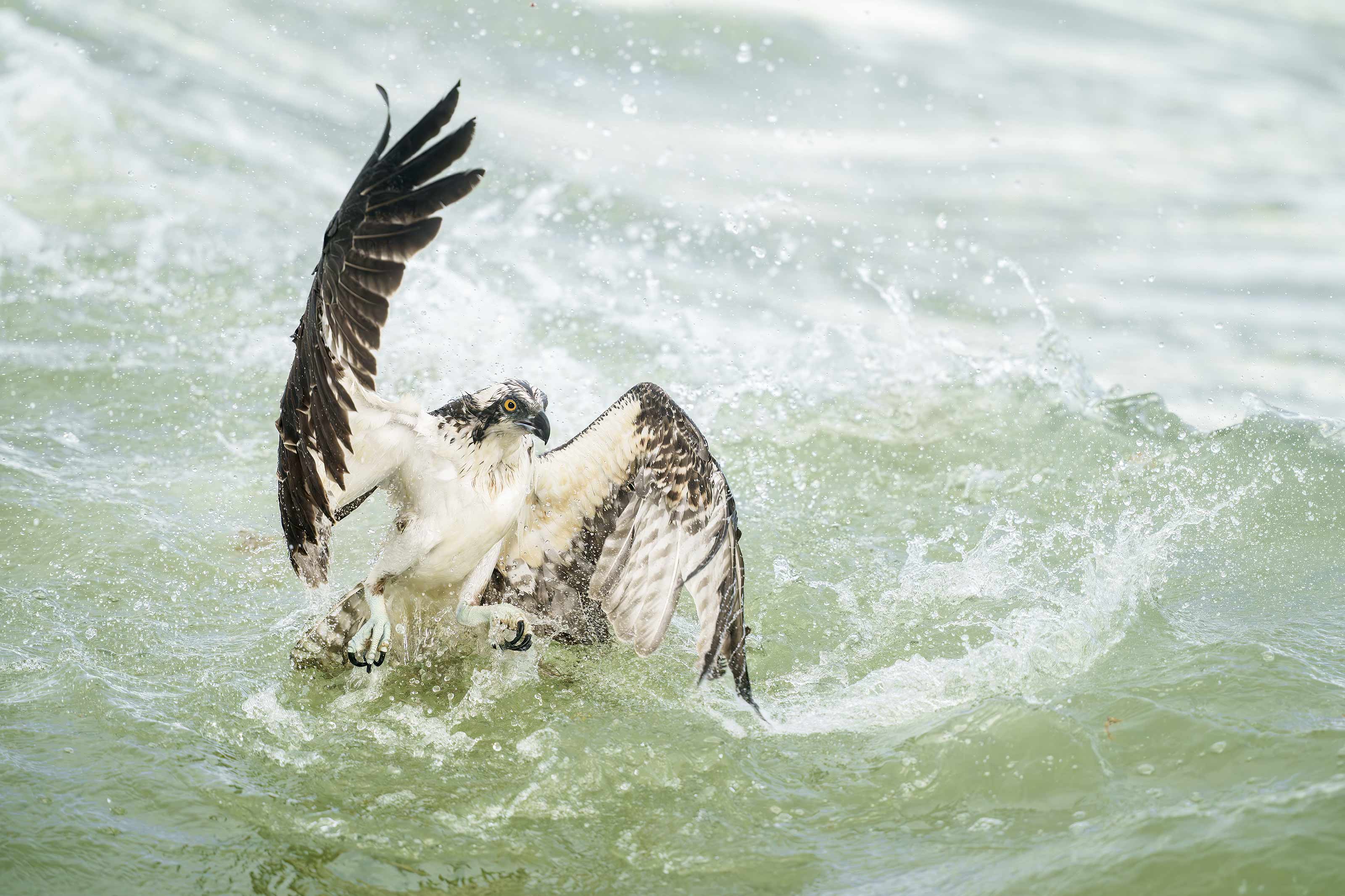 This frame was made as the Osprey struggled to lift off with its catch. The water is in close proximity so that there are lots of details in the waves. Compare this image with the next one and note the difference.