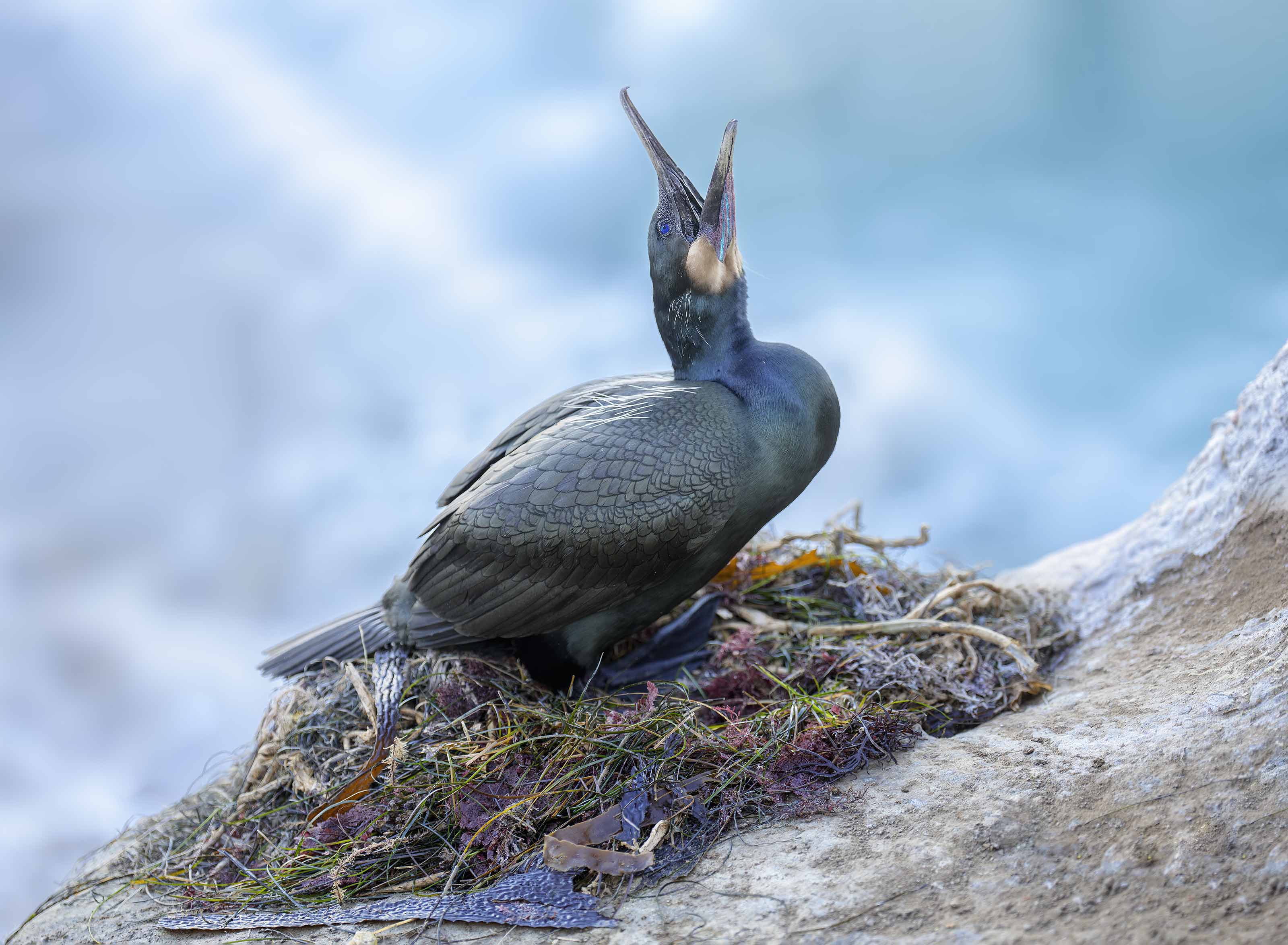 | This image was created by yours truly on 16 January 2025 on a San Diego Extended Instructional IPT. Standing at full height, I used the used the handheld Sony FE 70-200mm f/2.8 GM OSS II Lens (at 136mm) and The Latest Greatest Sony Flagship Body, the a1 II Mirrorless Camera. The exposure was determined via Zebras with ISO on the Thumb Wheel. ISO 500: 1/320 sec. at f/2.8 (wide open) in Manual mode. RawDigger showed that the exposure was perfect. AWB at 8:40:41am in the shade. Wide/AF-C with Bird-Eye/Face Detection performed perfectly. Click on the image to enjoy the larger, inexplicably sharper high-res version. Image #3: Brandt’s Cormorant on nest yawning |