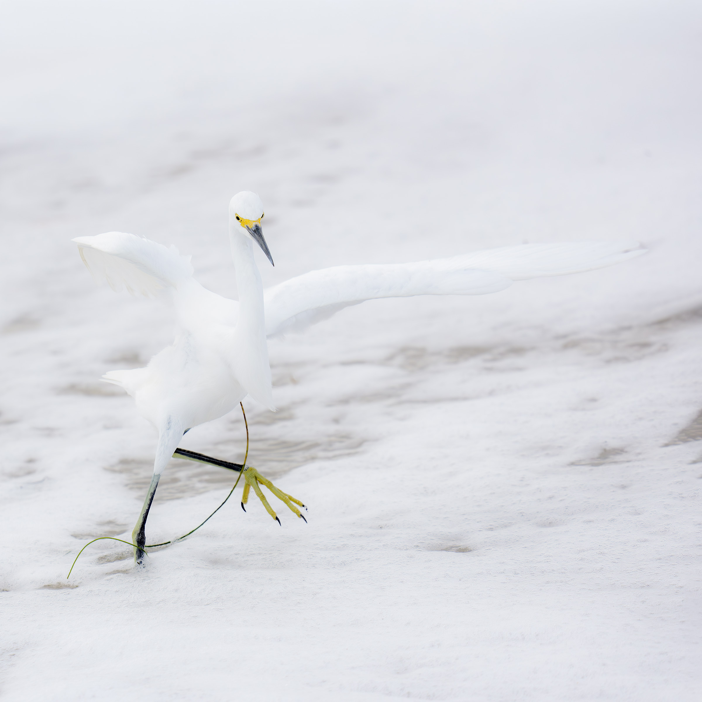 This image was also created by yours truly on 7 November 2025 at Sebastian Inlet State Park. Again, standing at full height, I used the handheld Sony FE 200-600mm f/5.6-6.3 G OSS lens (at 512mm) and the Latest Greatest Flagship Body, the Sony a1 II Mirrorless Camera. The exposure was determined via Zebras with ISO on the Thumb Wheel. ISO 2000: 1/3200 sec. at f/6.3 (wide open) in Manual mode. RawDigger showed that the exposure was dead solid perfect. AWB at 9:47:37am on a variably cloudy morning. Tracking: Zone/AF-C with Bird-Eye/Face Detection performed perfectly. Click on the image to enjoy a larger, inexplicably sharper high-res version. Image #2 Snowy Egret dancing on the edge of the surf |