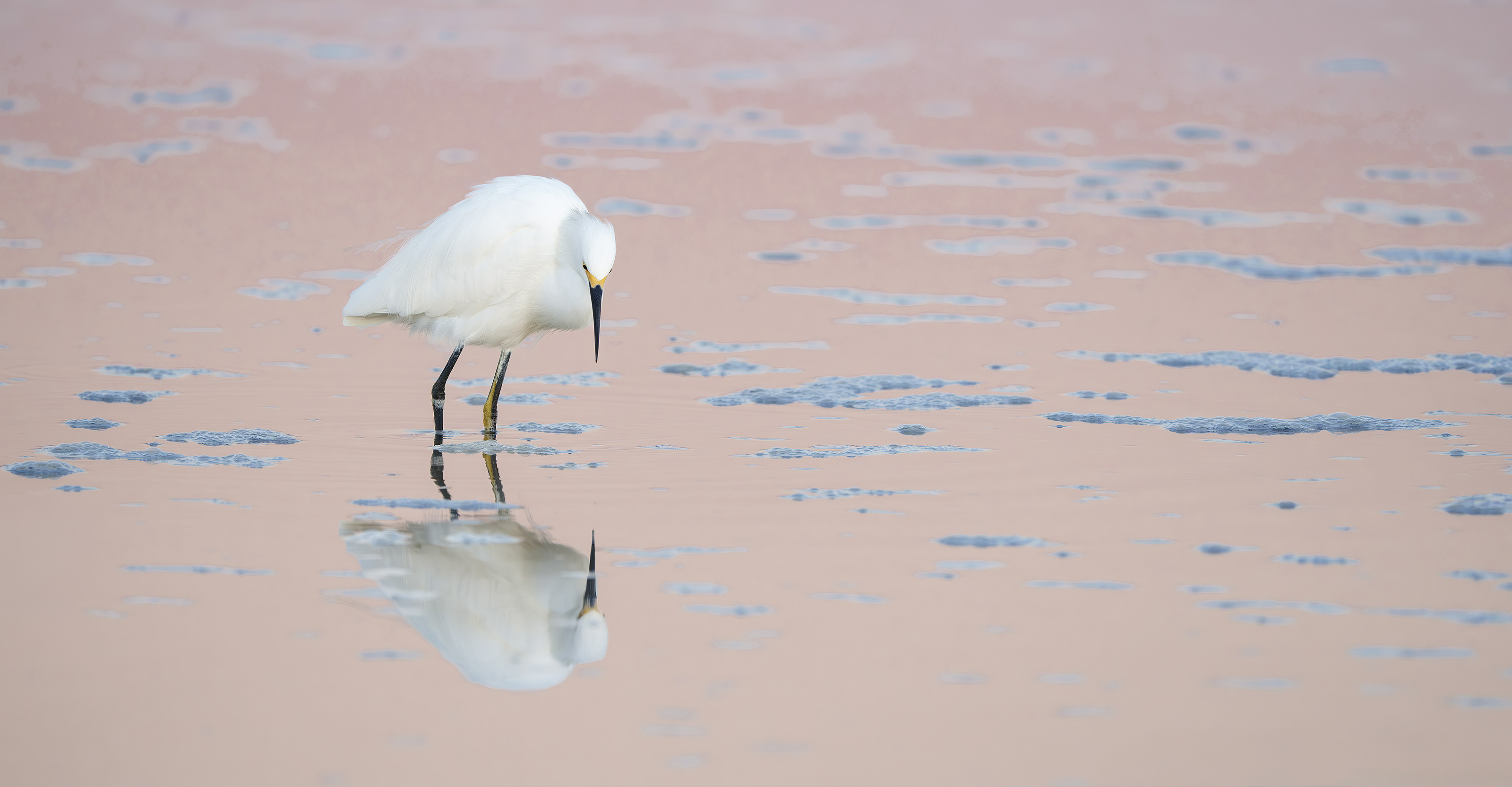 This image was created by multiple IPT veteran Jim Miller on 19 November 2025 at Sebastian Inlet State Park. Standing at full height, he used the a Wide/AF-C with Bird-Eye/Face Detection performed perfectly. Click on the image to enjoy a larger, inexplicably sharper high-res version. Image #8: Snowy Egret hunting in pink, pre-dawn reflections |