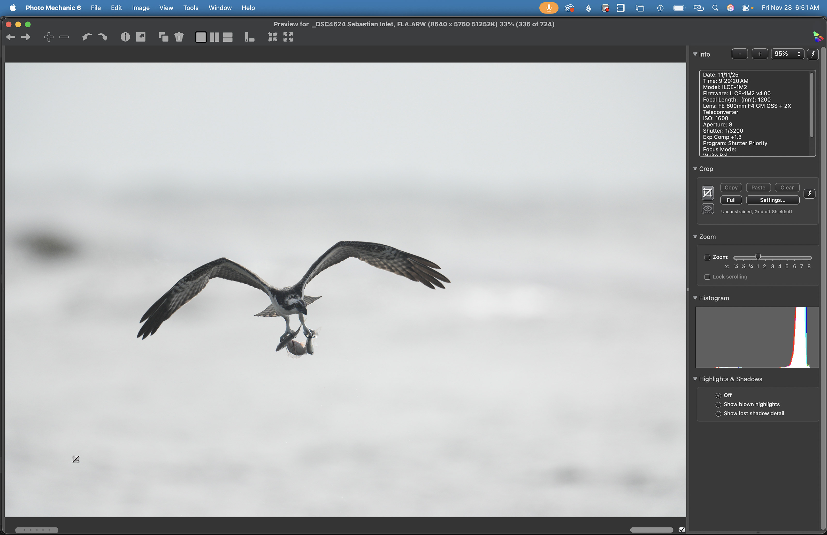 This image was created on 11 November 2025 by yours on a Sebastian Inlet Ospreys and More Extended IPT. Standing at full height on the North Jetty I used the Robus RC-5570 Vantage Series 3 Carbon Fiber Tripod/Levered-Clamp FlexShooter Pro-mounted Sony FE 600mm f/4 GM OSS lens with the Sony FE 2x Teleconverter and the Latest Greatest Sony Flagship Body, the a1 II Mirrorless Camera. The exposure was determined by Zebras with Exposure Compensation (EC) on the thumb wheel. Multi Metering +1.3 stops. AUTO ISO set ISO 1600: 1/3200 second at f/8 (wide open) in Shutter Priority mode. RawDigger showed that the exposure was dead-solid perfect. AWB at 9:29:20 am on a very cloudy morning. Wide/AF-C with Bird Eye/Face Detection enabled performed perfectly. Click on the image to enjoy the larger, inexplicably sharper high-res version. Image #1B: Osprey with three fish in its talons |