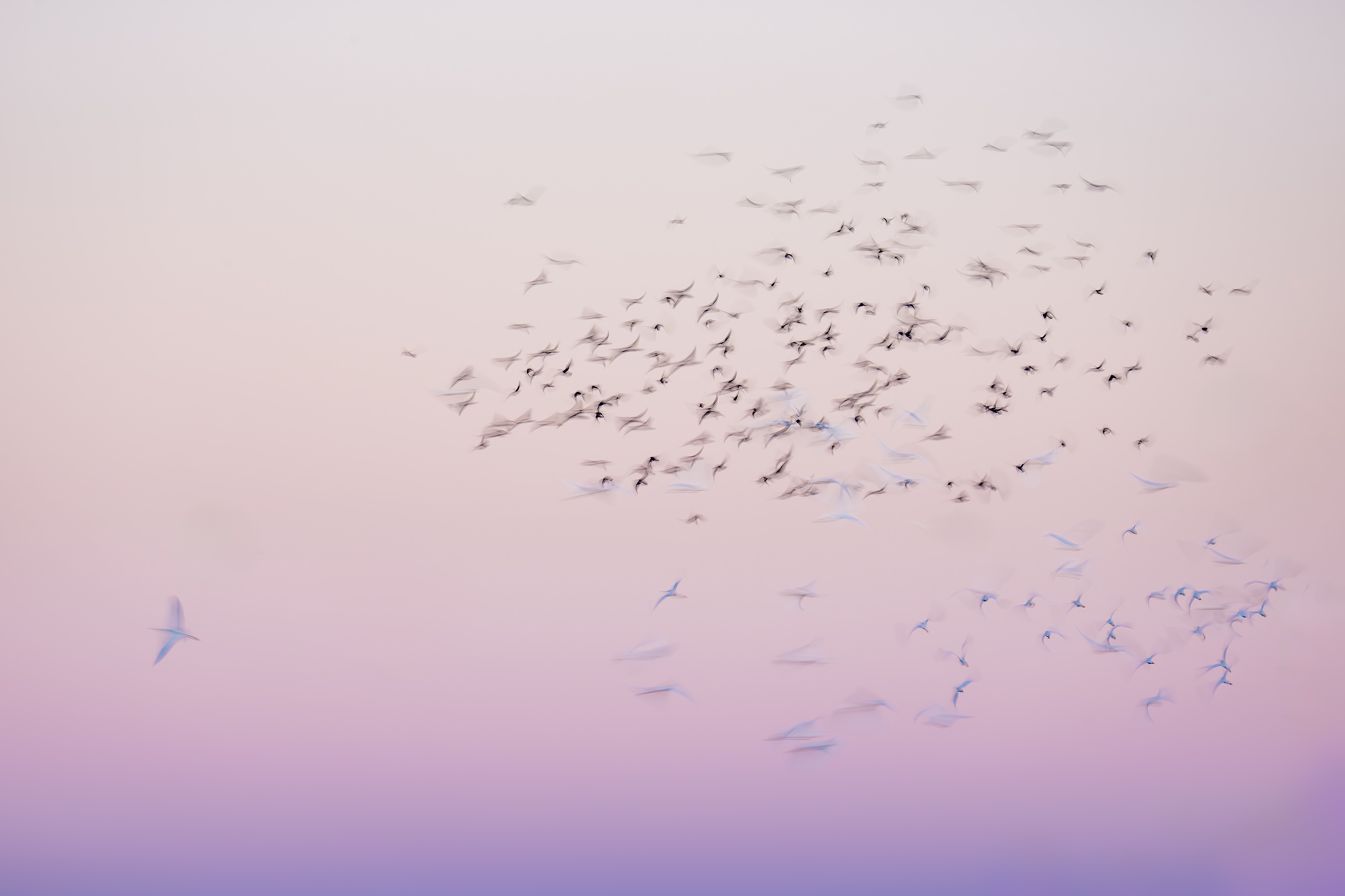 In #1 the single bird on the left makes the photo. Love the pink light.