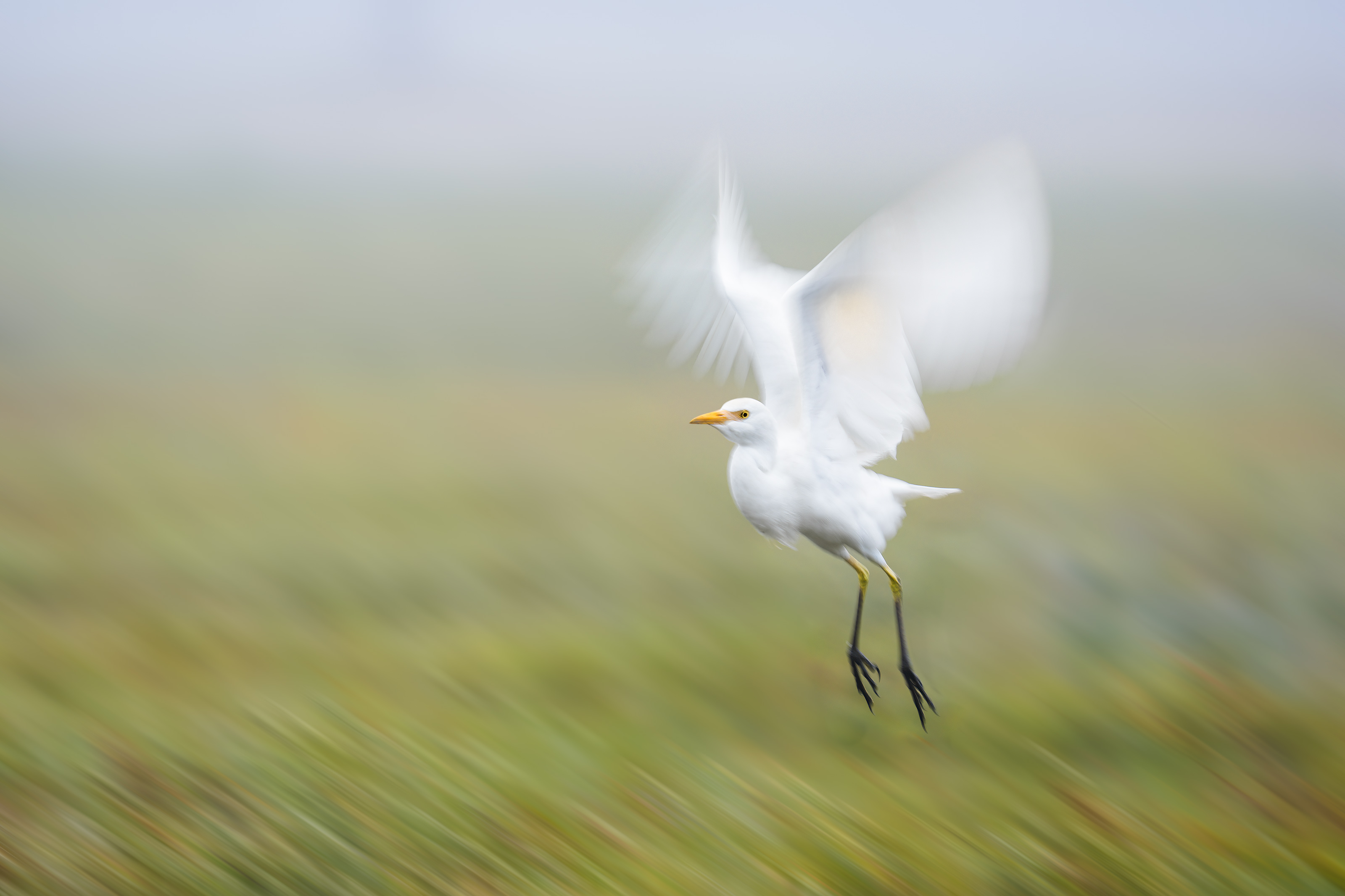 On Sunday past, there was thick fog with a NW wind. I spent an hour with a foraging flock of Cattle Egrets doing mostly flight blurs as they moved north time and time again in search of tiny gnats. The key was to drive a big circle around the flock and angle the car to the southwest so that the wind was behind me with the birds flying and taking off toward me as they always do. I created more than 1900 images and made one or two nice ones.