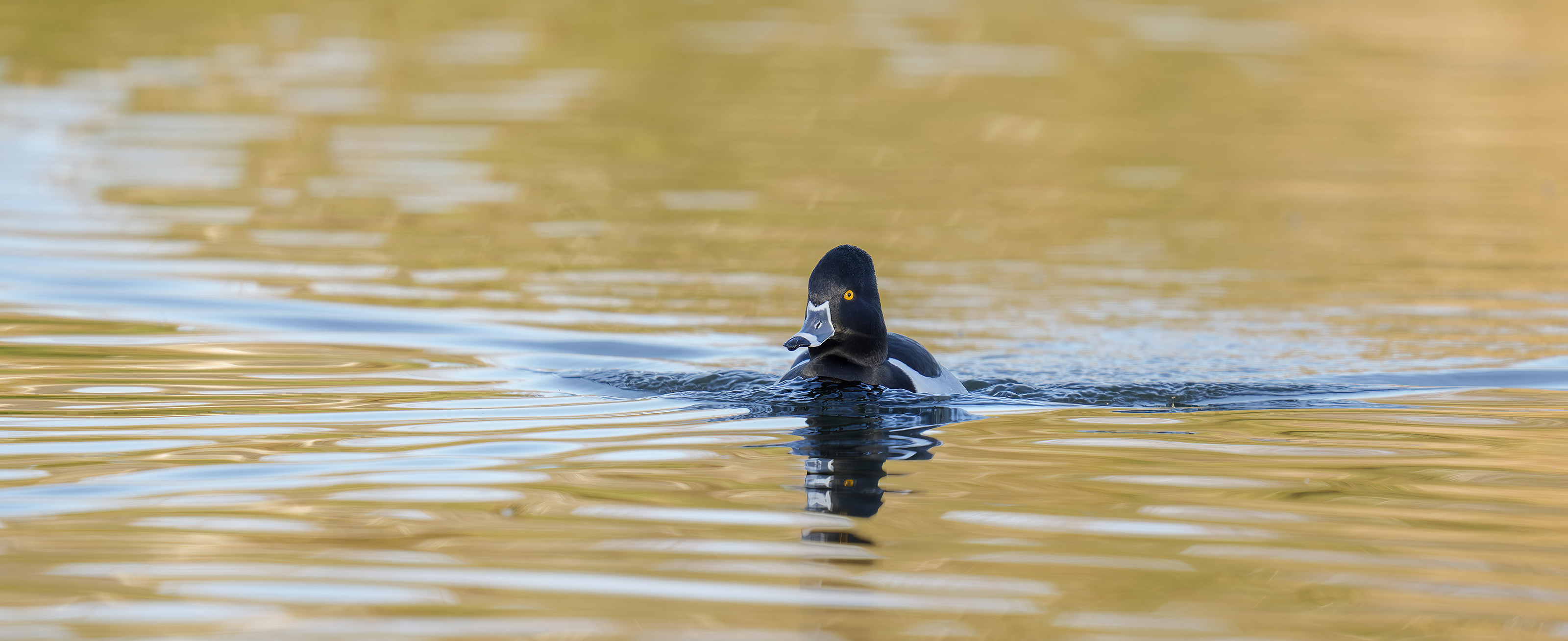 This image was created on 11 January 2026 at Santee Lakes Regional Park, CA. Seated on a sidewalk adjacent to Lake 5, I used the handheld Sony FE 200-600mm f/5.6-6.3 G OSS lens (at 600mm) and the The Latest Greatest Sony Flagship Body, the a1 II Mirrorless Camera. The exposure was determined by Zebras with Exposure Compensation (EC) on the thumb wheel. Multi Metering +1.7 stops. AUTO ISO set ISO 1600: 1/1250 second at f/6.3 (wide open) in Shutter Priority mode. AWB at 7:57:25am on a sunny morning. Wide/AF-C with Bird-Eye/Face Detection performed perfectly. Click on the image to enjoy the larger, inexplicably sharper high-res version. Image #3: Ring-necked Duck drake swimming pano crop