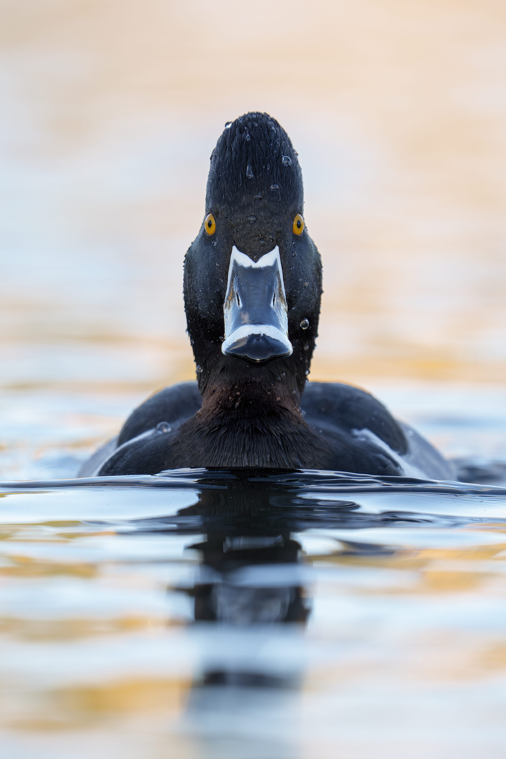 This image was created on 8 January 2026 at Santee Lakes Regional Park, CA. Seated on a tarmac road, I used the handheld Sony FE 200-600mm f/5.6-6.3 G OSS lens (at 541mm) and the The Latest Greatest Sony Flagship Body, the a1 II Mirrorless Camera. The exposure was determined by Zebras with Exposure Compensation (EC) on the thumb wheel. Multi Metering +2.0 stops. AUTO ISO set ISO 1600: 1/1000 second at f/6.3 (wide open) in Shutter Priority mode. AWB at 4:14:25pm on a sunny afternoon in the shade of a hill to the west. Wide/AF-C with Bird-Eye/Face Detection performed perfectly. Click on the image to enjoy the larger, inexplicably sharper high-res version. Image #2: Ring-necked Duck drake staring down the lens barrel