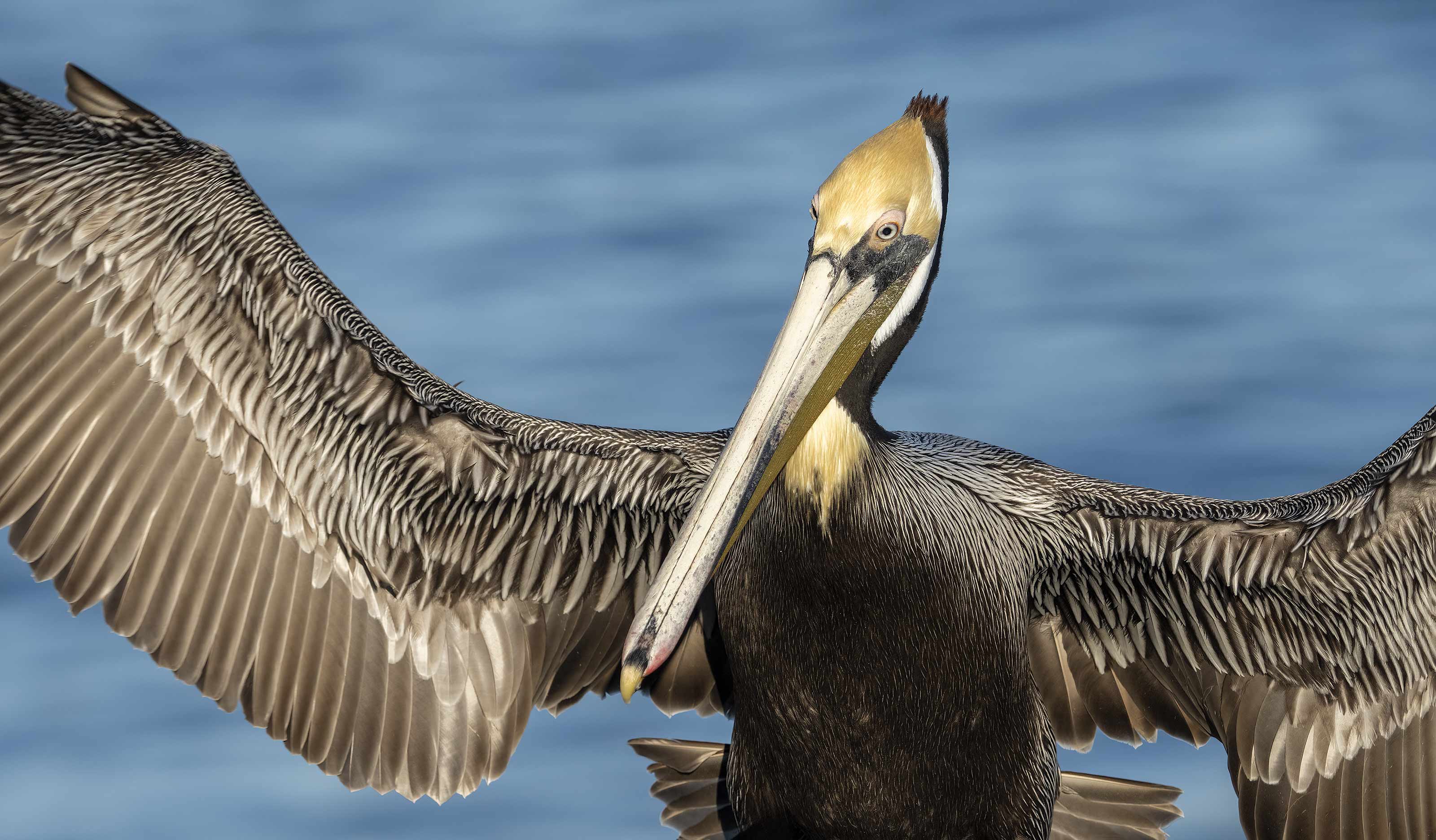 This image was created on 15 January 2026 by yours truly at La Jolla, CA on the first San Diego Extended IPT. Standing at full height by the Bridge Club, I used the Tracking: Zone/AF-C with Bird-Eye/Face Detection performed perfectly. Click on the image to enjoy the larger, inexplicably sharper high-res version. Image #10: Brown Pelican Pacific race breeding plumage in flight — wings up pose |