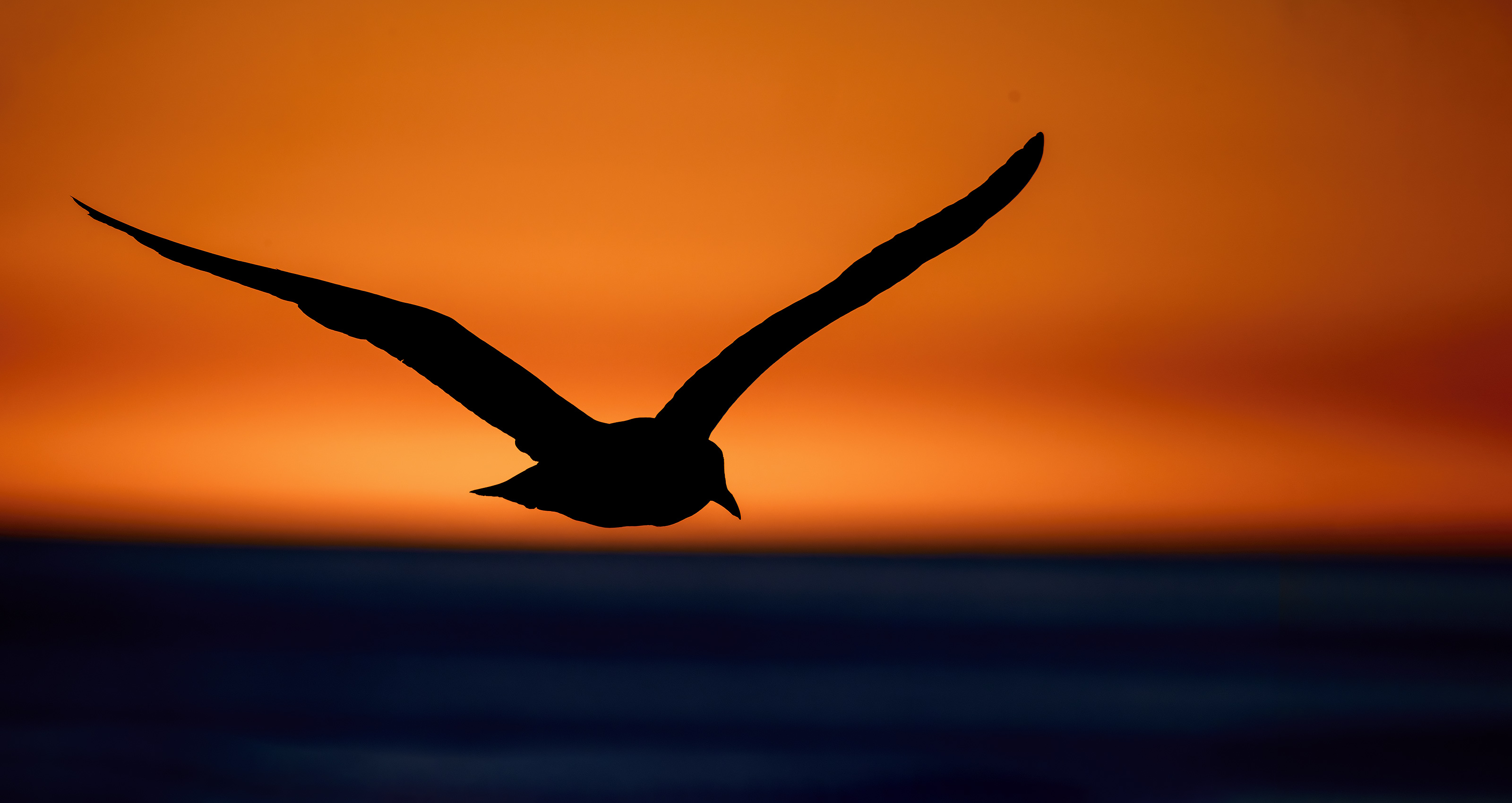 I had gone to the 1.4X TC so that I could make distant subjects larger in the frame. My maximum focal length was 1120mm. When I saw the gull at close race approaching the bright orange glow, I zoomed out as quickly as possible in an effort to fit the bird in the frame. I call this technique esti-zooming as you are just estimating — you could say guessing, how much to zoom out. You never think of a number, you simply need to react instinctually.