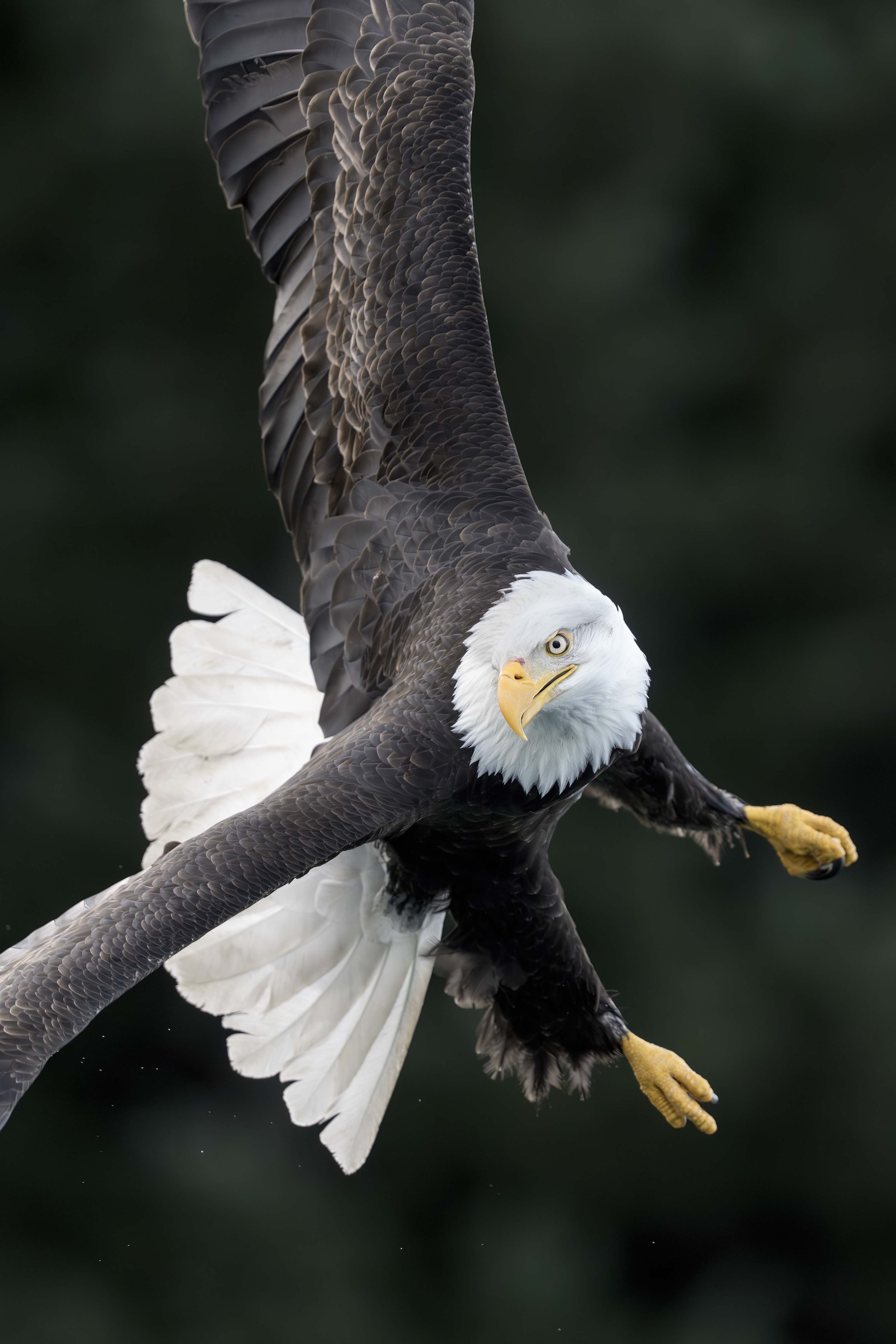 This image was created on 16 February 2026 by multiple IPT veteran Jim Dolgin at Kachemak Bay, Homer, AK. Standing on the deck of our work (eagle) boat, he used the handheld Sony FE 300mm f/2.8 GM OSS Lens (Sony E) and The Latest Greatest Sony Flagship Body, the a1 II Mirrorless Camera. ISO 1600. The exposure was determined via Zebras with ISO on the Thumb Wheel; 1/4000 sec. at f/2.8 (wide open) in Manual mode. AWB at 2:04:55 pm on a cloudy afternoon. Wide/AF-C with Bird Eye/Face Detection enabled performed perfectly. Image #1: Bald Eagle vertical bank with dark background |