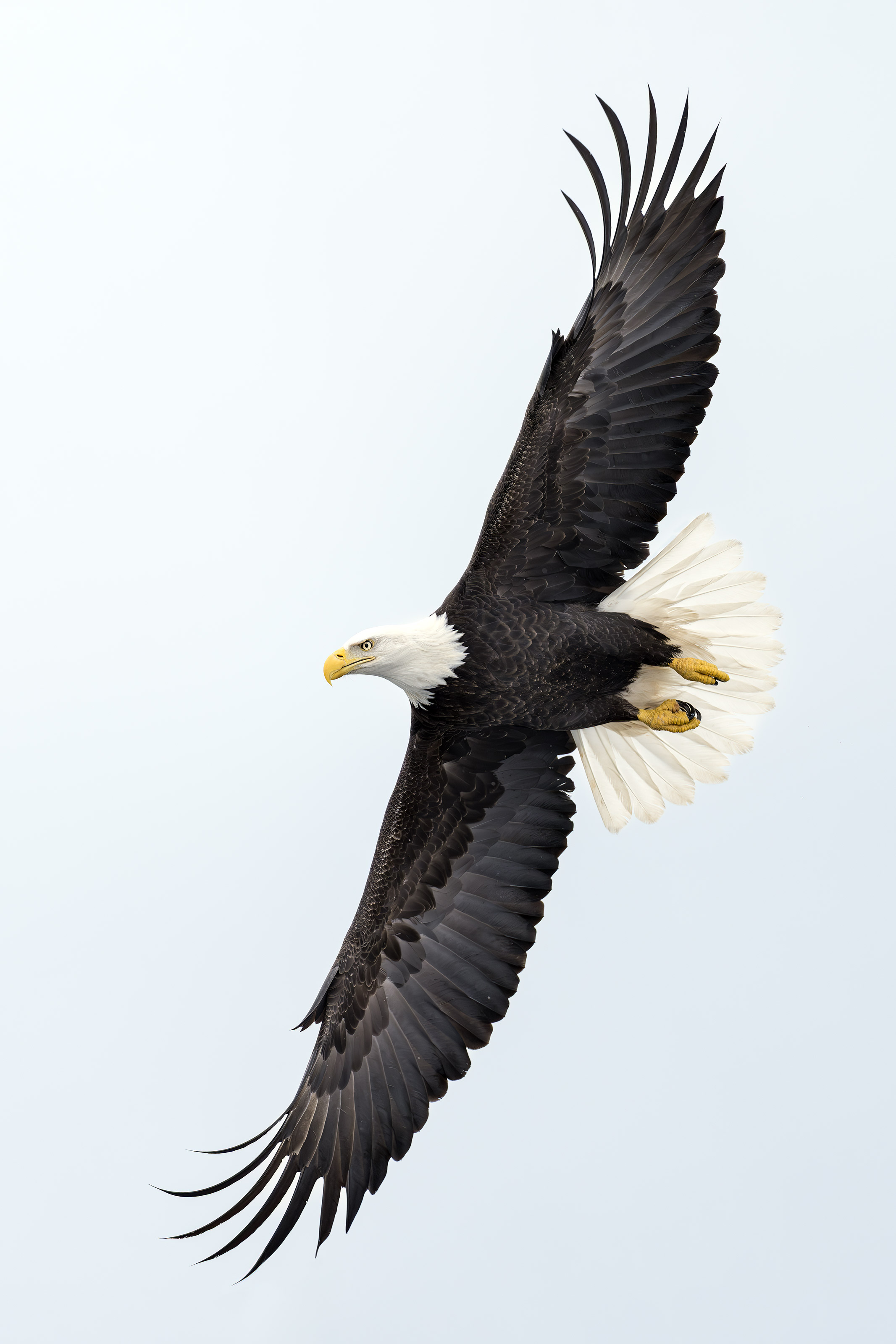 I almost fit this handsome eagle into the frame but clipped the tips of the two longest primary feathers in this otherwise spectacular horizontal image. I painted a Quick Mask of the third longest primary feather and used it to repair both clipped feathers. When you start clipping wingtips while working horizontally the birds are telling you that it is time to begun holding the camera on end and trying to create some vertical originals. So when the banking birds are too close, that is exactly what I try to do.