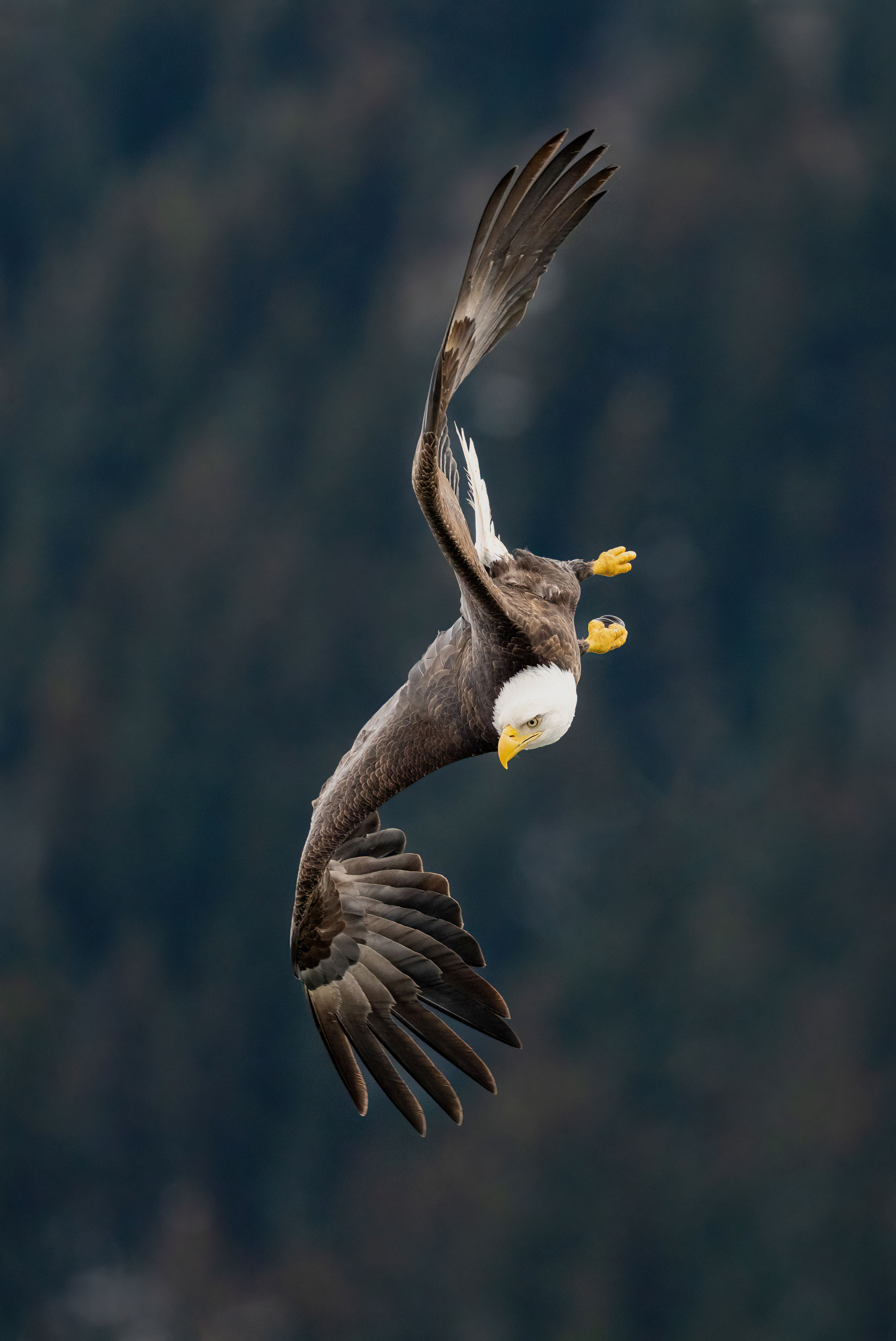 This image was created on 16 February 2026 by yours truly at Kachemak Bay, Homer, AK on the first 2026 Homer IPT. Standing on the deck of our work (eagle) boat, I used the handheld Sony FE 300mm f/2.8 GM OSS Lens (Sony E) with the Sony FE 1.4x Teleconverter (at 420mm) with the Latest Greatest Sony Flagship Body, the a1 II Mirrorless Camera. The exposure determined via Zebras with ISO on the Thumb Wheel. ISO 3200: 1/3200 sec. at f/4 (wide open) in Manual mode. AWB at 3:14:05pm in the shade of a tall cliff on a sunny afternoon. Wide/AF-C with Bird Eye/Face Detection enabled performed perfectly. Click on the image to enjoy the larger, inexplicably sharper high-res version. Image #11: Bald Eagle adult high banking flight |