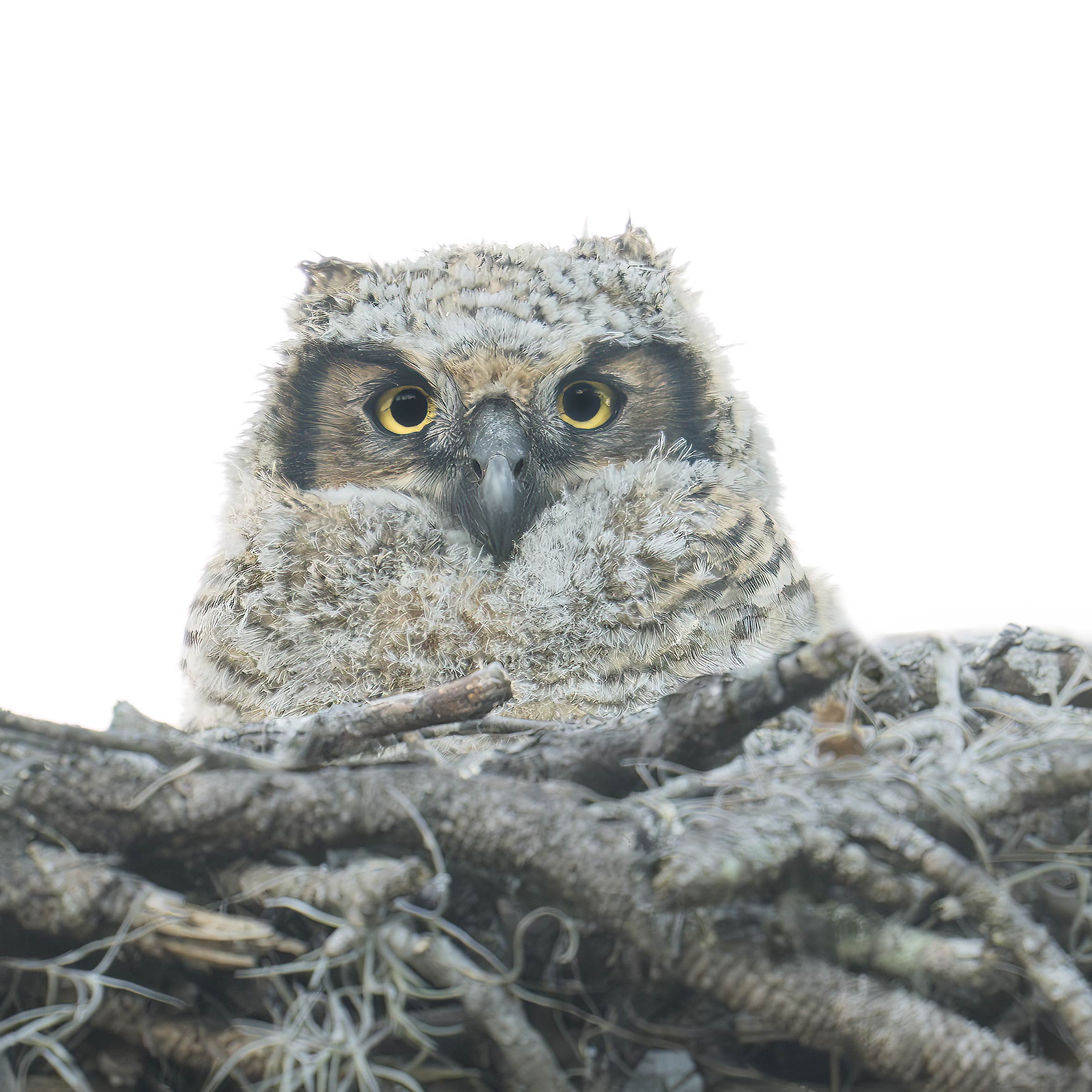 This image was created on 26 February 2026 at Indian Lake Estates, FL. Standing on a lawn, I used the Robus RC-5570 Vantage Series 3 Carbon Fiber Tripod/Levered-Clamp FlexShooter Pro-mounted Sony FE 600mm f/4 GM OSS lens with the Sony FE 2x Teleconverter and The Latest Greatest Sony Flagship Body, the a1 II Mirrorless Camera. The exposure was determined using Zebra technology with ISO on the Thumb Dial. ISO 2500. 1/125 second at f/8 (wide-open) in Manual Mode. AWB at 7:11:16am before sunrise on a then cloudy morning. Manual Focus with focus peaking and 5-second timer performed perfectly. Click on the image to enjoy the high-res version. Image #1: Great Horned Owl chick in platform nest |