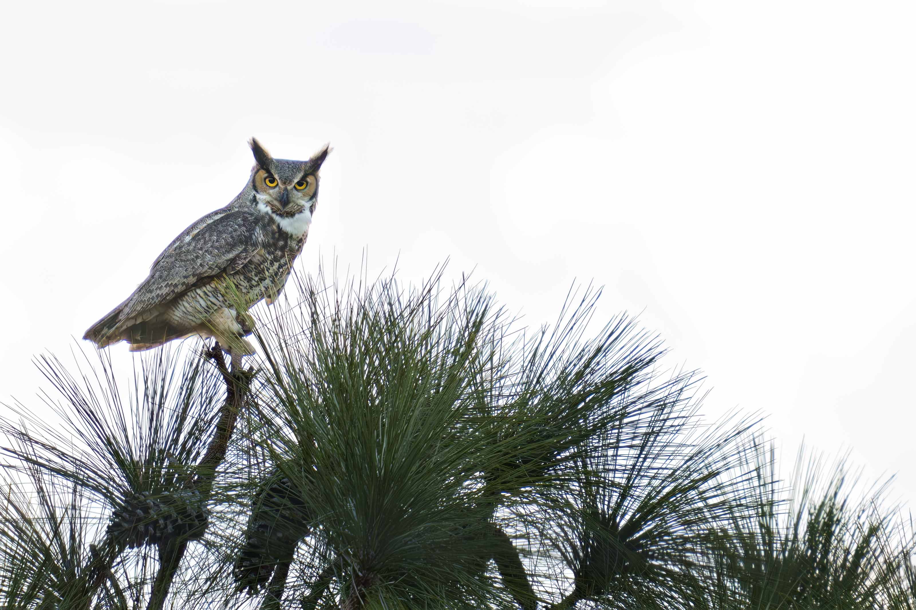 In my 42-year plus career, I have had very few opportunities to photograph Great Horned Owl. A month ago, Clint, a local fisherman, alerted me to an owl nest on an Osprey platform just minutes from my home. The pole the nest is on is quite tall so the shooting angle (the angle of inclination) is very steep. There are phone wires just above the platform. On sunny days, there simply is no shot. On cloudy days or in the shade, photography is very challenging. We visited the owls on Wednesday morning and Bob Eastman took a few snaps. Thus inspired on Thursday morning I created Image #1 below. Bob spotted one of the adult perched in a pine tree and created a few images before the owl flew west away from the nest. As we walked back to the car we both looked up to see an adult Bald Eagle swooping down on the nest, its eyes on breakfast. We both gasped.