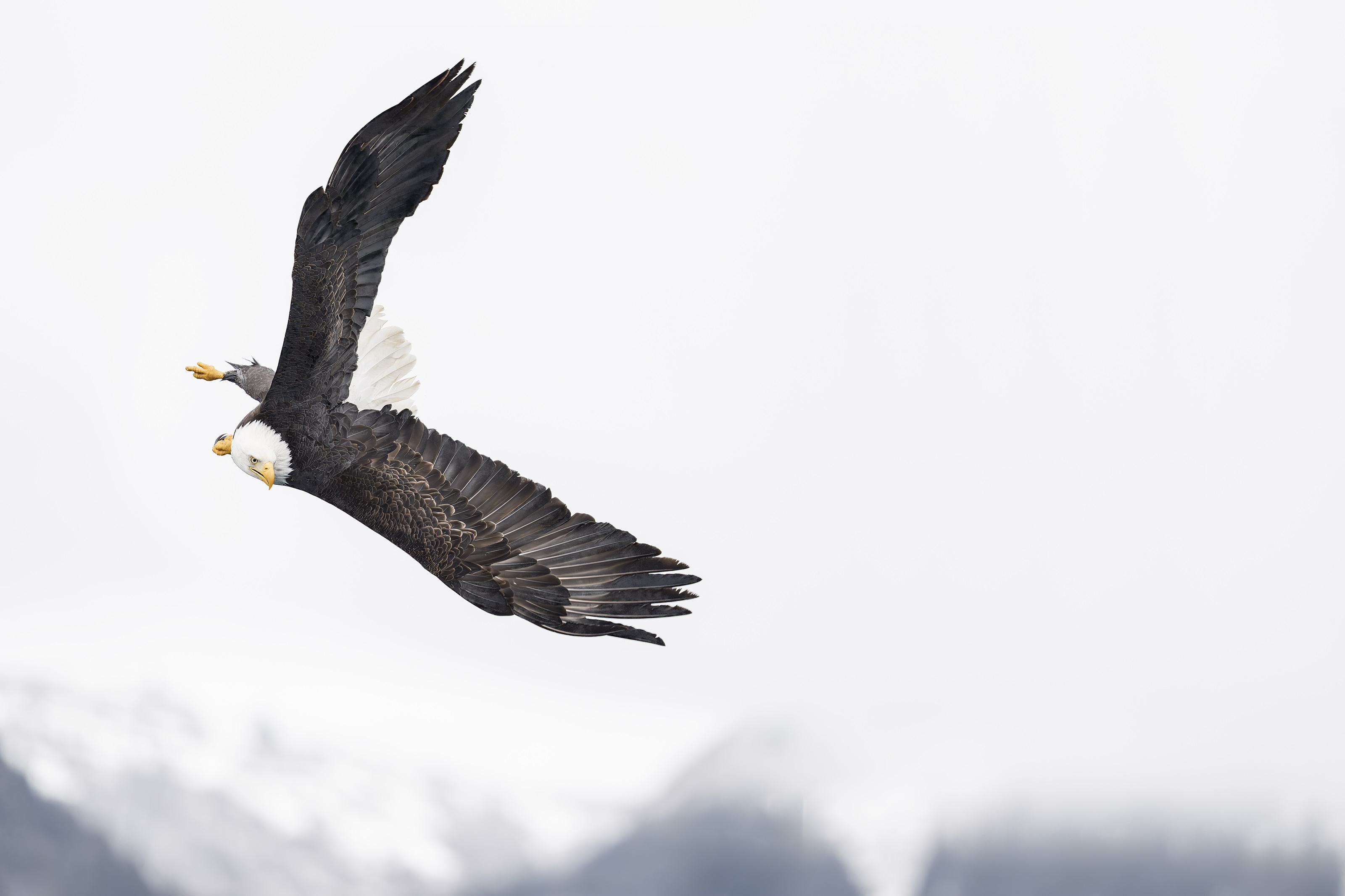 This image was created on 18 February 2026 by yours truly at Kachemak Bay, Homer, AK. Standing on the deck of our work/eagle boat, I used the handheld Sony FE 300mm f/2.8 GM OSS Lens (Sony E) and The Latest Greatest Sony Flagship Body, the a1 II Mirrorless Camera. The exposure was determined via Zebras with ISO on the Thumb Wheel. ISO 4000: 1/3200 sec. at f/2.8 (wide open) in Manual mode. AWB at 3:35:51am on a cloudy afternoon. Wide/AF-C with Bird Eye/Face Detection enabled performed perfectly. Image #2: Bald Eagle adult beginning dive — dorsal view with mountain background |