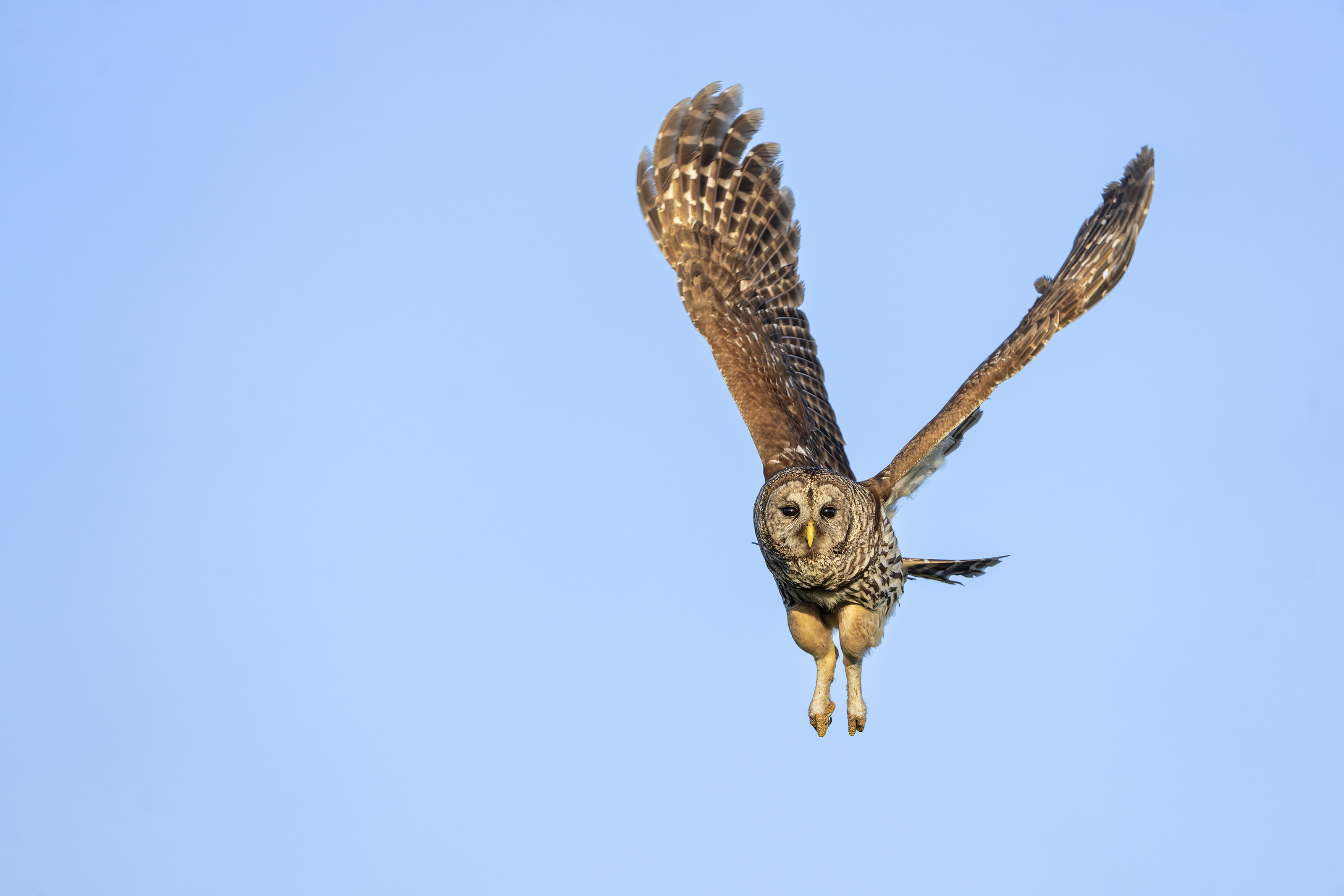 This image was created on 15 March 2026 at Indian Lake Estates by my good friend Bob Eastman sitting behind me in my SUV. He used the hand held Sony FE 200-600mm f/5.6-6.3 G OSS lens (at 444mm) and The One, the Sony Alpha 1 Mirrorless digital camera. ) The exposure was determined using Zebra technology with ISO on the Thumb Dial. ISO 800. 1/3200 second at f/6.3 (wide-open) in Manual Mode. AWB at 8:15:28am on sunny morning. Tracking: Spot (XS) AF-C with Bird Face/Eye Detection performed perfectly. Be sure to click on the image to enjoy a high-res version. Image #5: Barred Owl in flight with wings raised