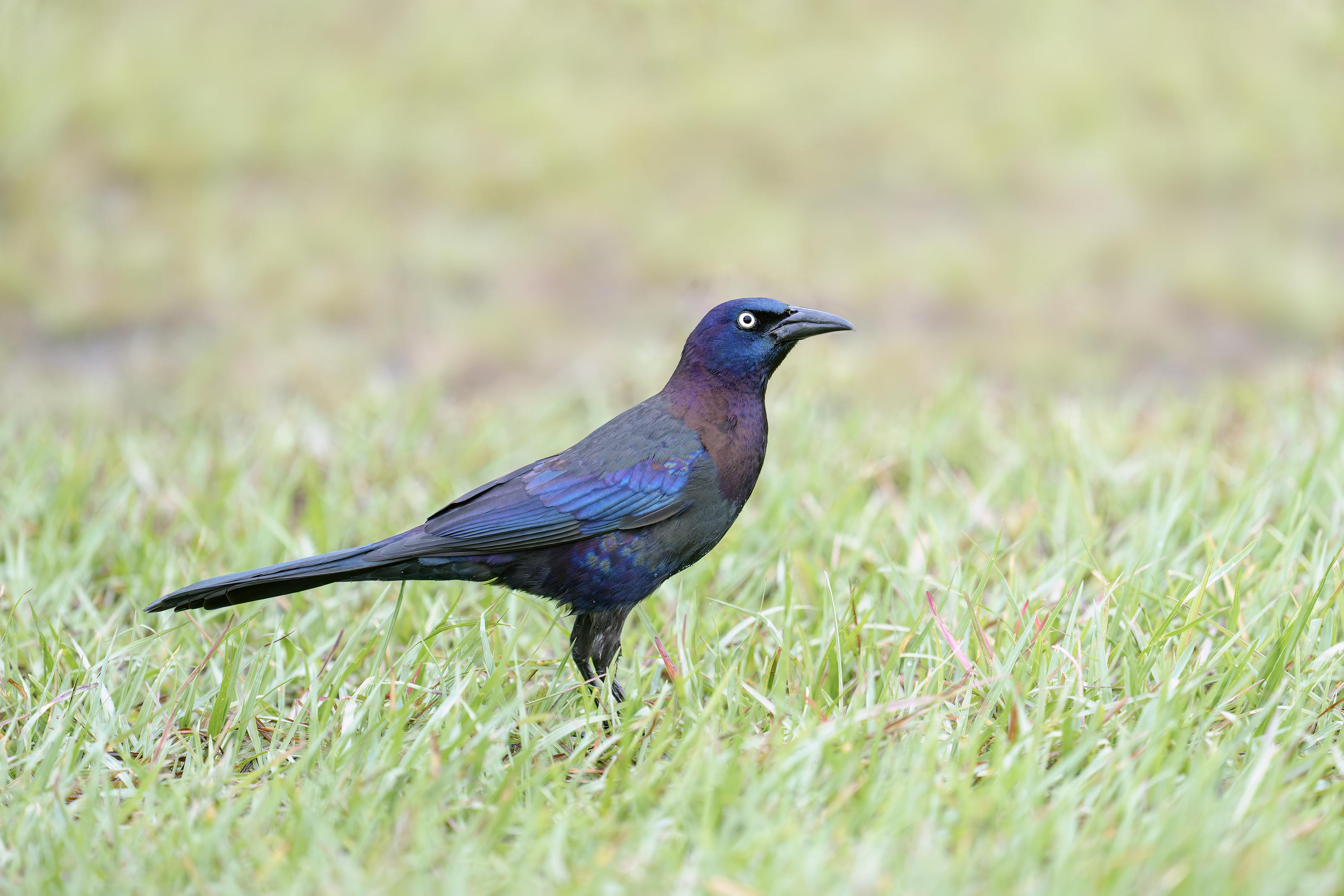 This image was created on 9 April 2026 by yours truly down by the lake near my home at Indian Lake Estates, FL. Seated in the driver’s seat of my SUV, I used the BLUBB-supported Sony FE 600mm f/4 GM OSS lens and The Latest Greatest Sony Flagship Body, the a1 II Mirrorless Camera). The exposure was determined using Zebra technology with ISO on the Thumb Wheel. ISO 2500: 1/500 second at f/4 (wide open) in Manual mode. With 253 OvExp pixels, RawDigger showed that the raw file brightness for this one was dead solid perfect. AWB at 8:08:23am on a wet, cloudy-dark morning. Wide/AF-C with Bird-Eye/Face Detection performed perfectly. Click on the image to enjoy the high-res version. Image #1: Common Grackle (Florida) male |